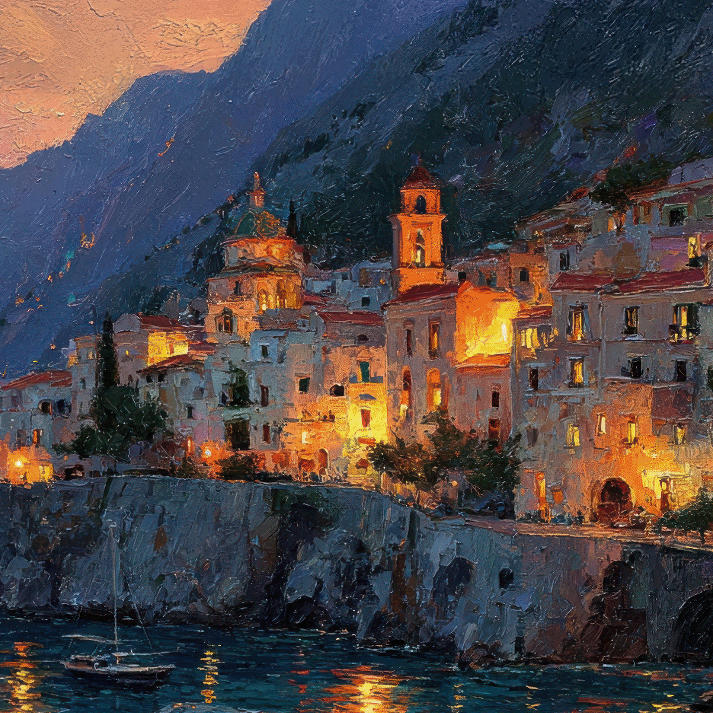 As dusk settles, warm golden lights glow from the hillside buildings, reflecting across the deep blue water below. The dramatic cliffs fade into twilight while the village comes alive with colour and movement, captured through rich texture, expressive brushwork, and a cinematic evening palette.