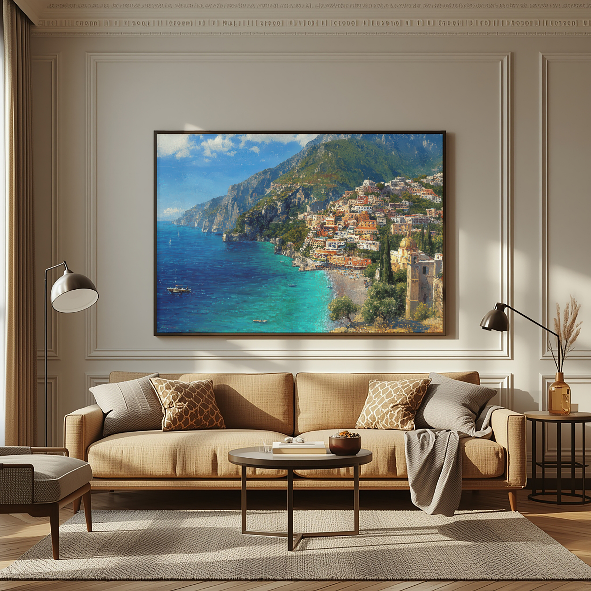 Bring the sun-washed beauty of the Amalfi Coast into your home with this atmospheric wall art print inspired by Positano, one of Italy’s most iconic coastal towns.